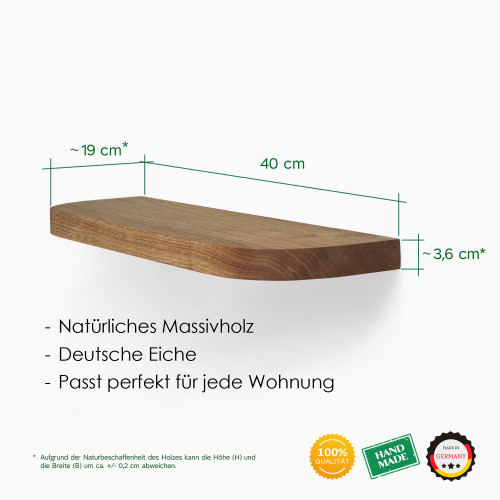 Dieses Wandregal wurde aus 100% deutscher Eiche gefertigt. Die einzigartige Holzmaserung und abgerundete Ecken verleihen dem Regalbrett sein besonderes Aussehen. Ein Möbelstück, das sich vielfältig verwenden lässt, zum Beispiel im Flur/ Büro/ Wohnzimmer/ Schlafzimmer/ Arbeitszimmer/ Badezimmer oder in der Küche. Natürliche Risse und Astlöcher wurden mit einem speziellen Zweikomponentenharz versiegelt. Für eine sichere und glatte Haptik wurde die hölzerne Oberfläche professionell von einem Schreiner bearbeitet und mit hochwertigem Wachs überzogen, welches das Regalbrett vor Umwelteinflüssen schützt. Das Regalbrett ist direkt zur Montage bereit.