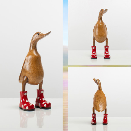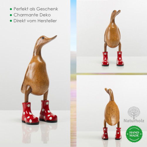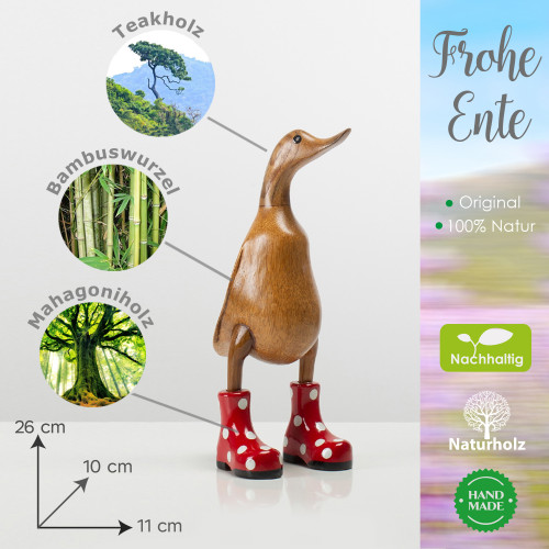 Unikat in Handarbeit: Jede Ente wird liebevoll aus drei ausgewählten Holzarten gefertigt: Der Kopf aus Teak, der Körper aus Bambus und die Schuhe sowie die Absatz-Details aus Mahagoniholz