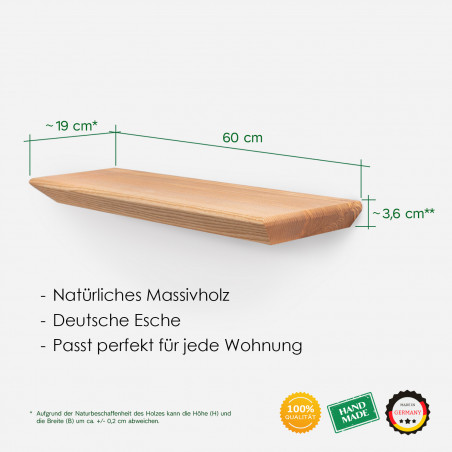 MASSIVHOLZ AUS DEUTSCHLAND: Für unser Wandregal wird nur ausgesuchte deutsche Esche verarbeitet. Jedes Wandboard ist dadurch ein Unikat mit einzigartiger Holzmaserung. Wir verwenden nur Massivholz für unsere Regalbretter - kein Leimholz.